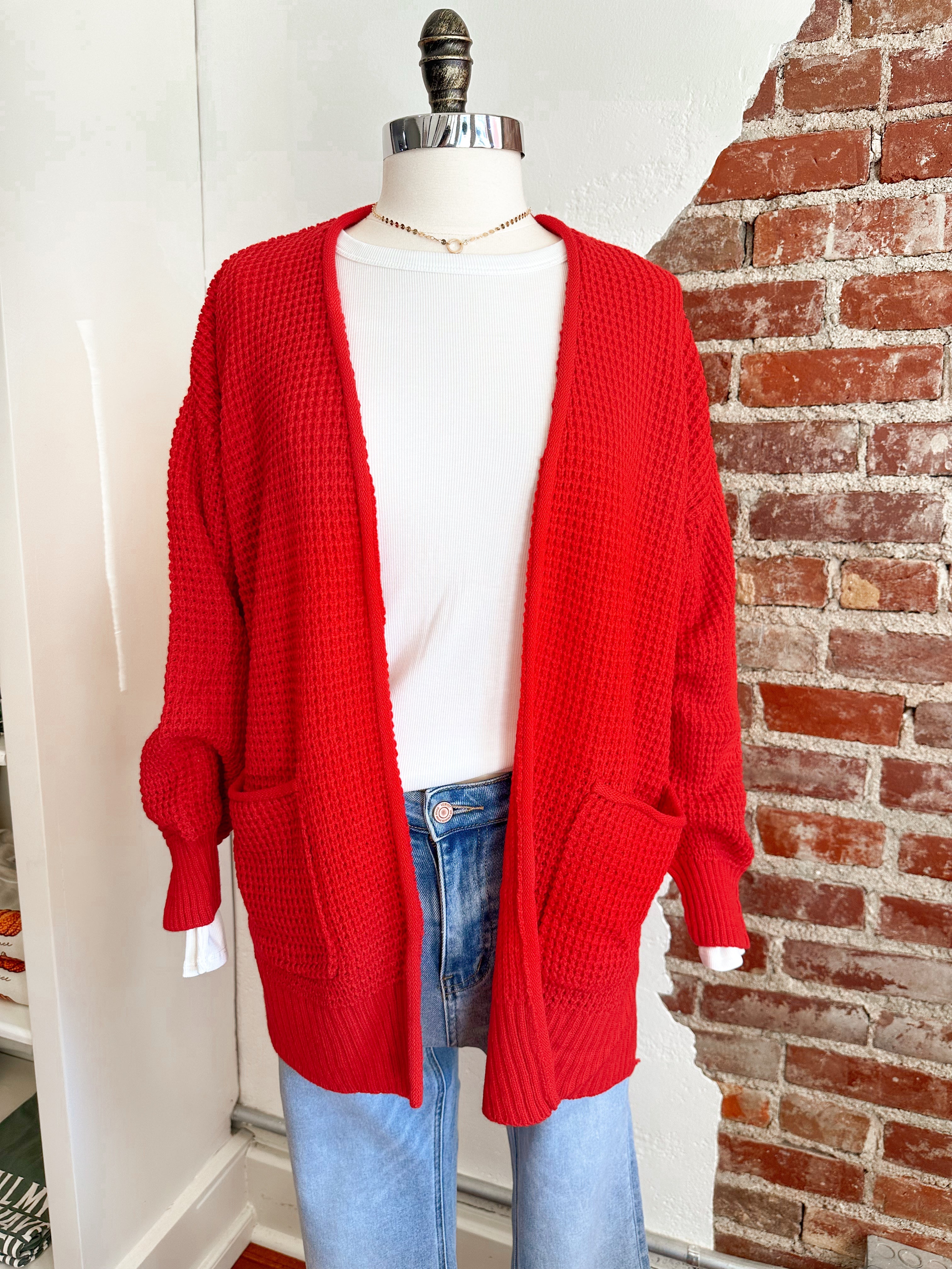 Get ready to cozy up in style with our Waffle Cardigan in Red! This fun and playful cardigan features convenient pockets, perfect for keeping your hands warm or storing small items. Made with a cozy waffle knit material, it's the perfect addition to your wardrobe for those chilly days.