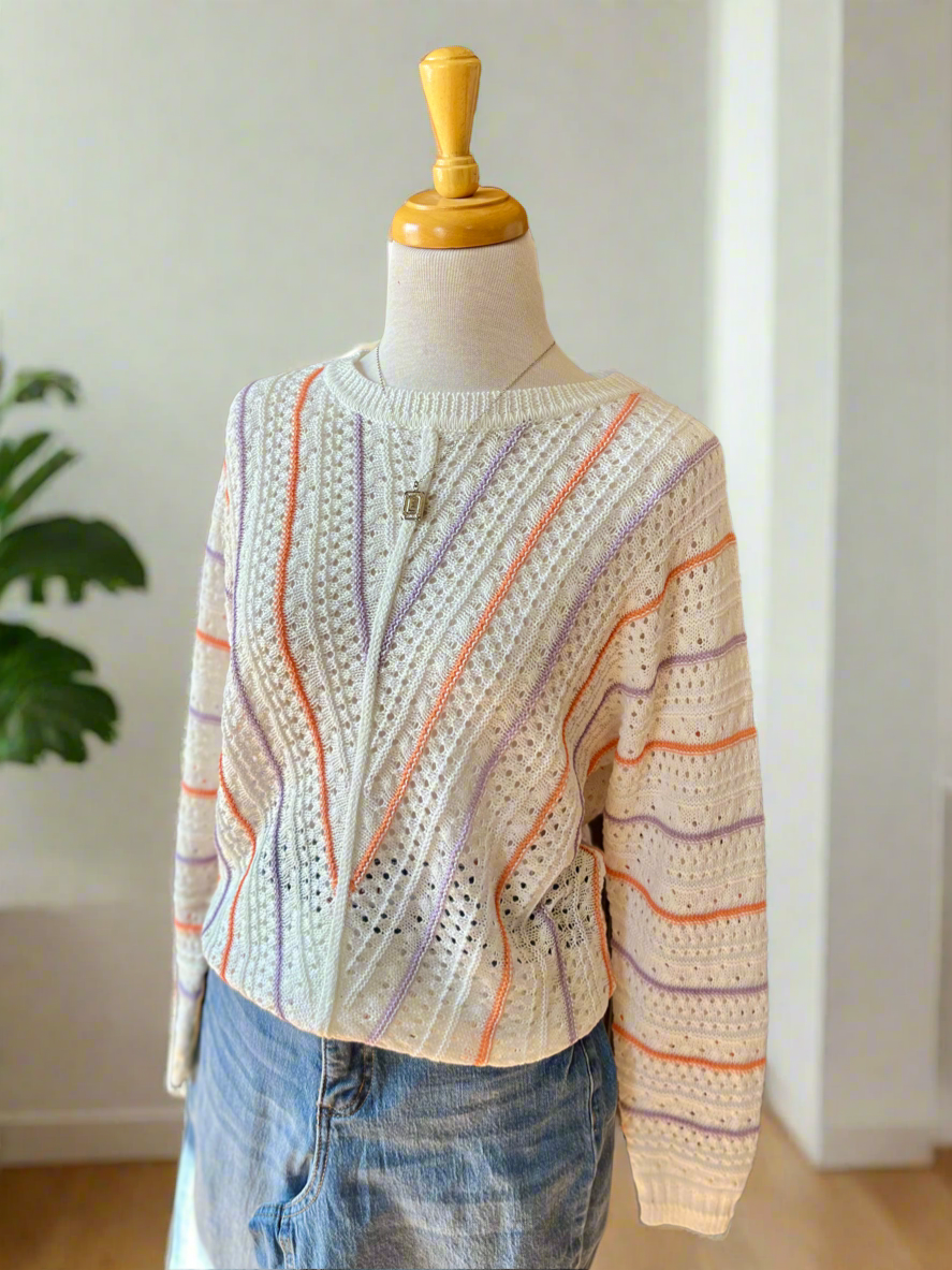Stay stylish and comfortable with Sadie's lightweight multi-color stripe sweater. Featuring white, peach, and lavender stripes, this sweater also has a crochet design and dolman sleeves for a trendy touch. Keep springy and chic with this must-have addition to your wardrobe.