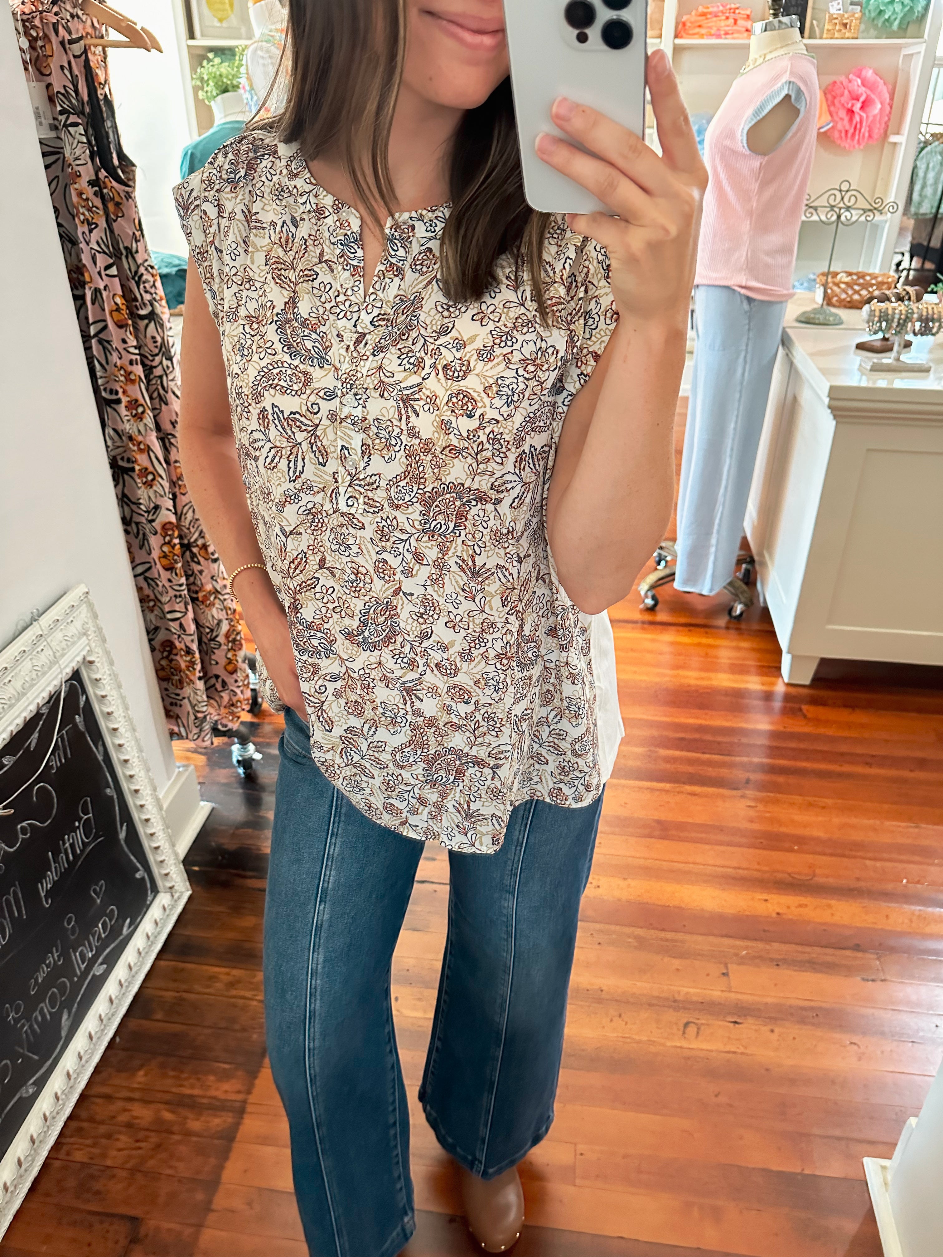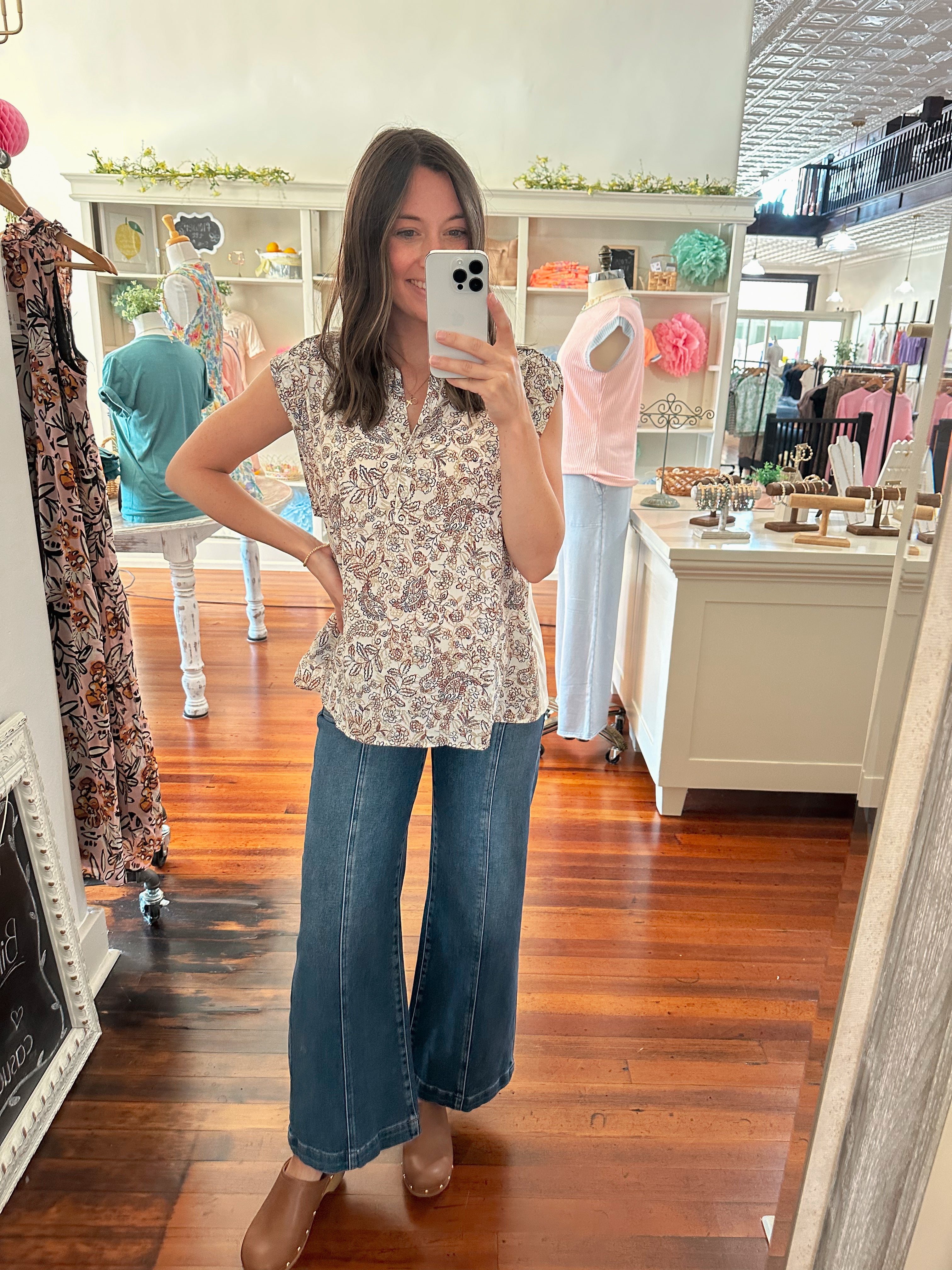 This adorable paisley Henley top is your perfect summer-to-fall companion! The short sleeves keep you cool during warm days, while the classic Henley neckline adds just enough coziness for those first crisp evenings. Pair with shorts now and layer under a cardigan later for effortless seasonal style that's as cute as it is versatile!